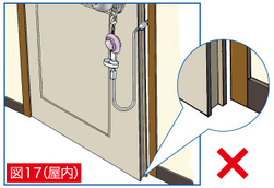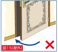 ■ A. 外出時の防犯(ドア)―屋外で操作する場合(機能2)、以下のような場合は使用できません。 ● 1.屋外で操作する場合、“外開き”または“横開き”のドアにしか使用できません。内開き”のドアは適用外 です。 ● 2.V字クリップは、基本的にドアとドア枠が平坦で開口部が直角に当たる物に使用します。 ドアとドア枠の形状やサイズが特殊な物には使用できない場合があります。 ● 3.ドア枠の周辺に突出状の飾りがある場合や、ドアの側面が凹んだ形状では屋外から操作する時に、 V字クリップの開口部が引っかかって完全にドアが閉められない可能性があります。 ● 1.